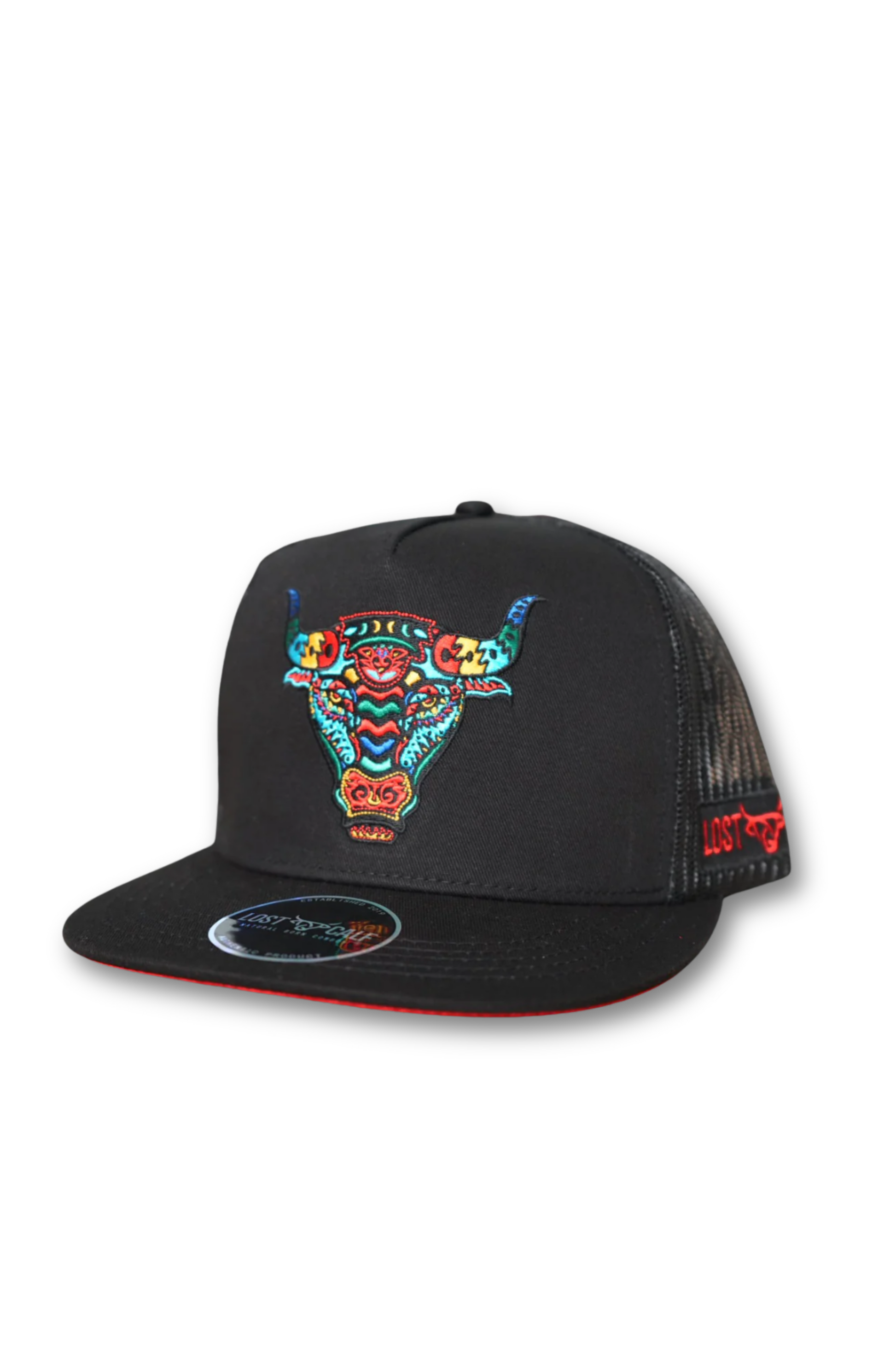 Baseball cap with Alebrije bull logo embroidered on front , Lost Calf logo on left side. Snap back - one size fits all.