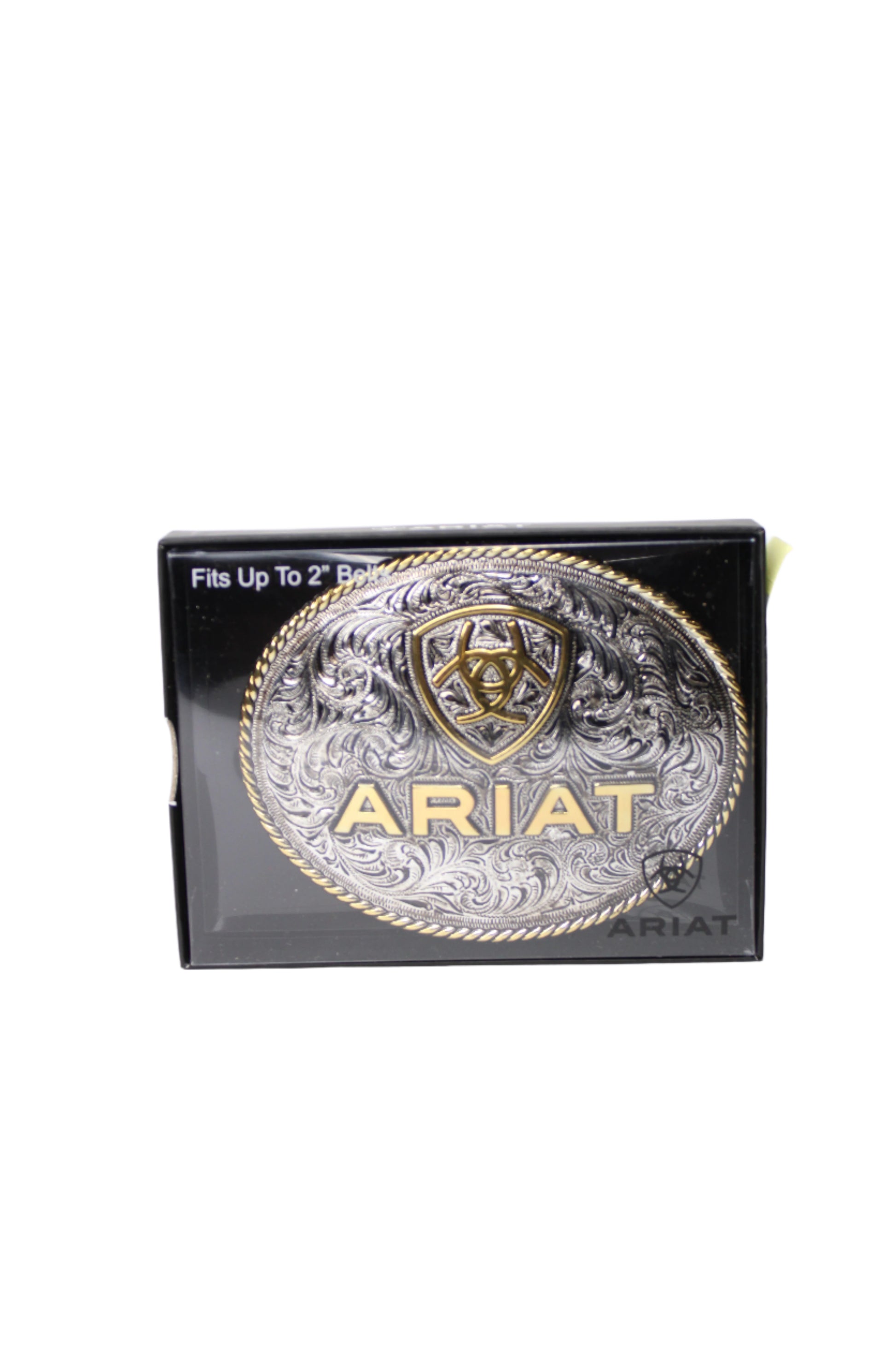 Flashy Ariat buckle by M&F Western Products. It has a silver and gold finish with a scrolling engraved background in silver. Ariat shield and word logo engraved in gold across front of the buckle with a gold rope edge.