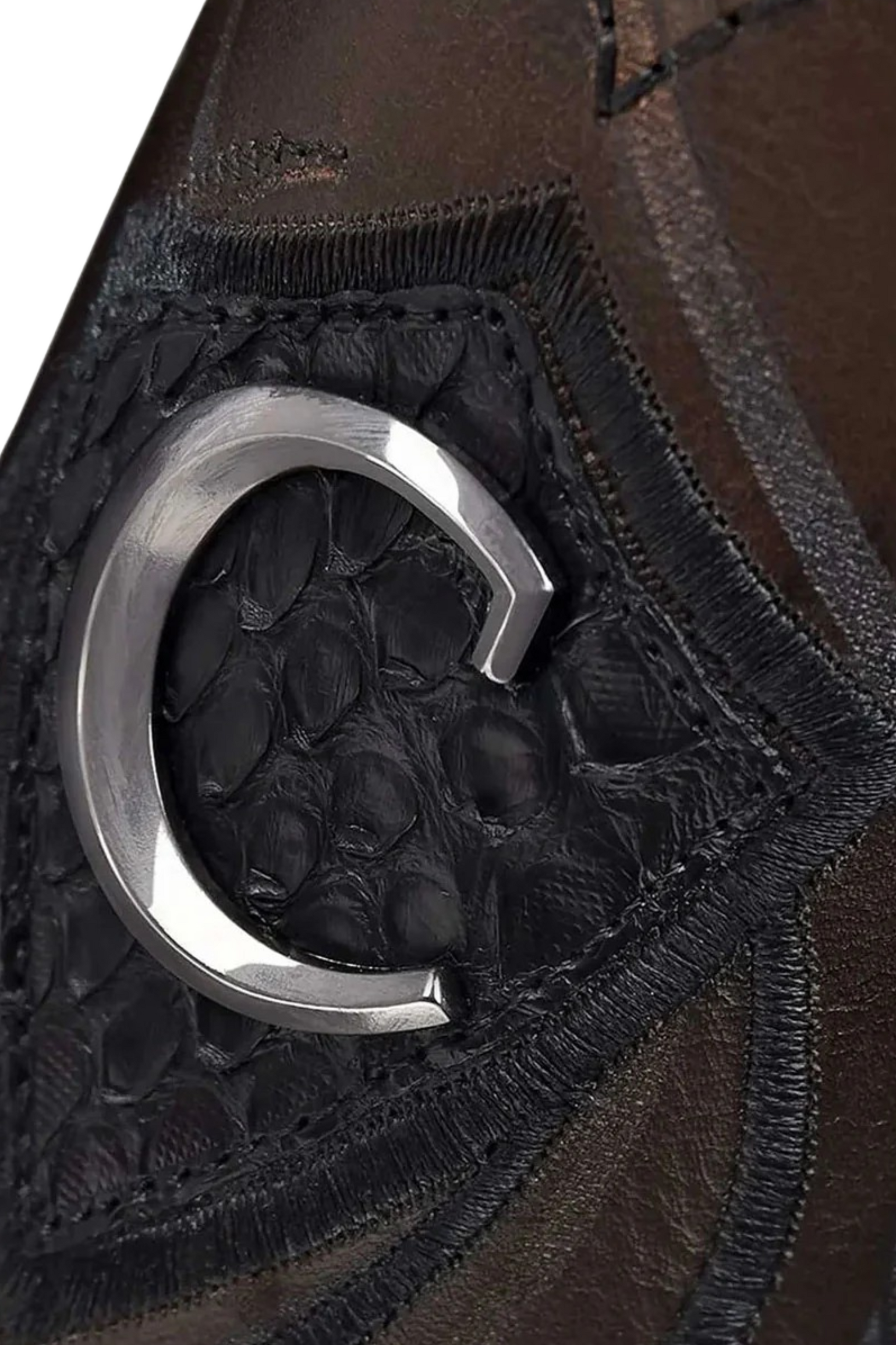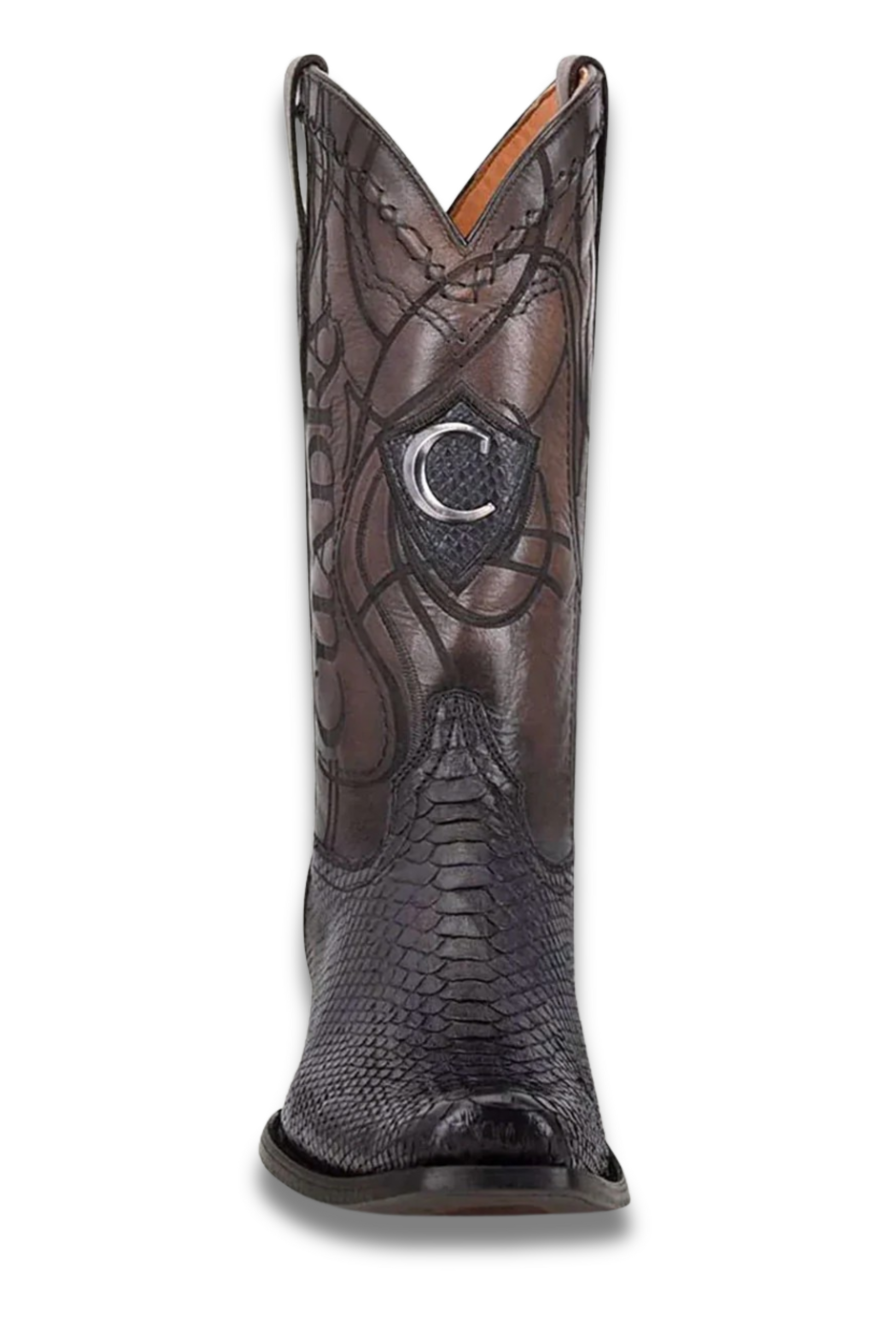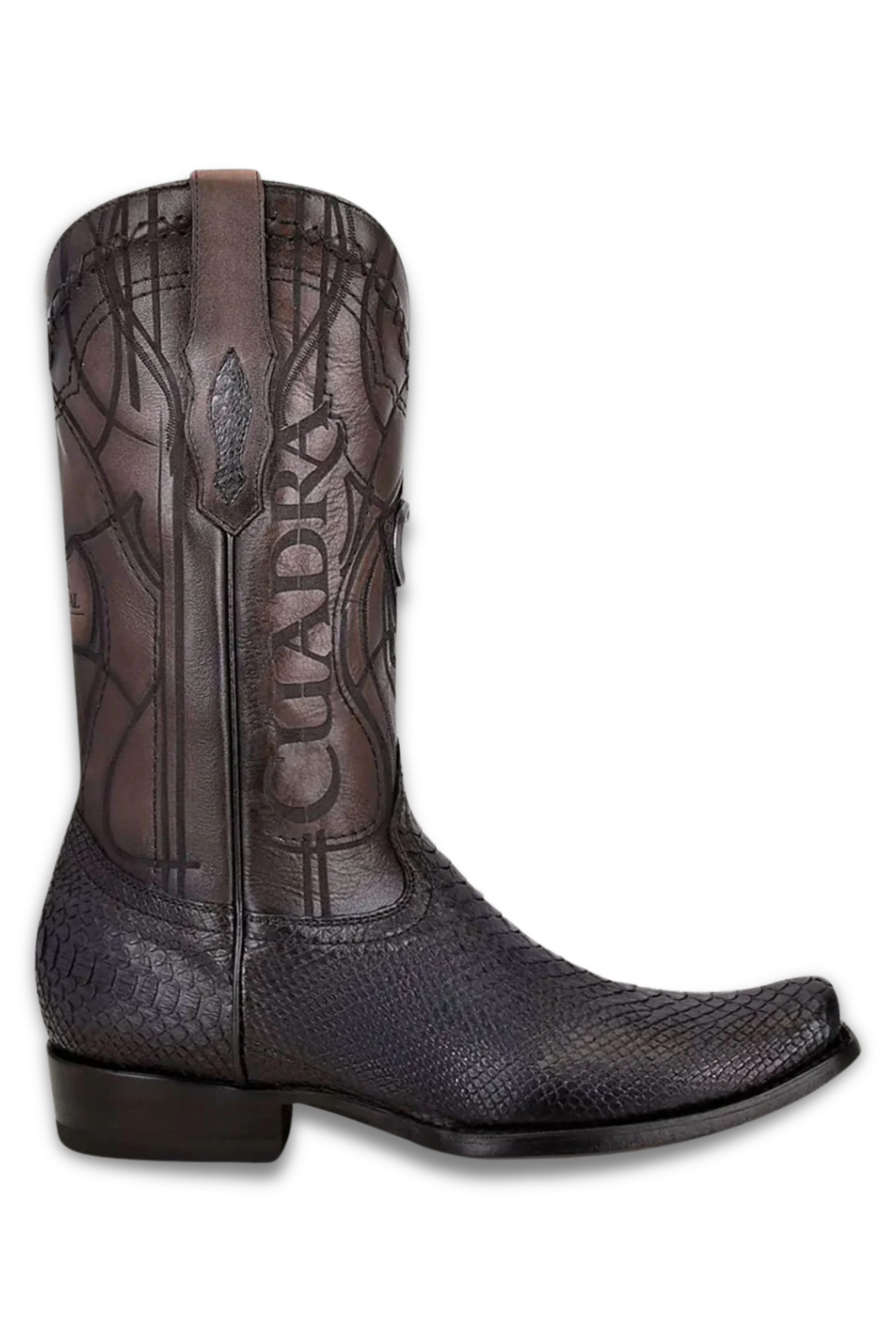 The shaft of these men’s boots showcases a stunning hand-painted python leather finish, intricate laser engraving, and a refined metallic Cuadra monogram. This artistic touch seamlessly blends Western heritage with modern elegance.