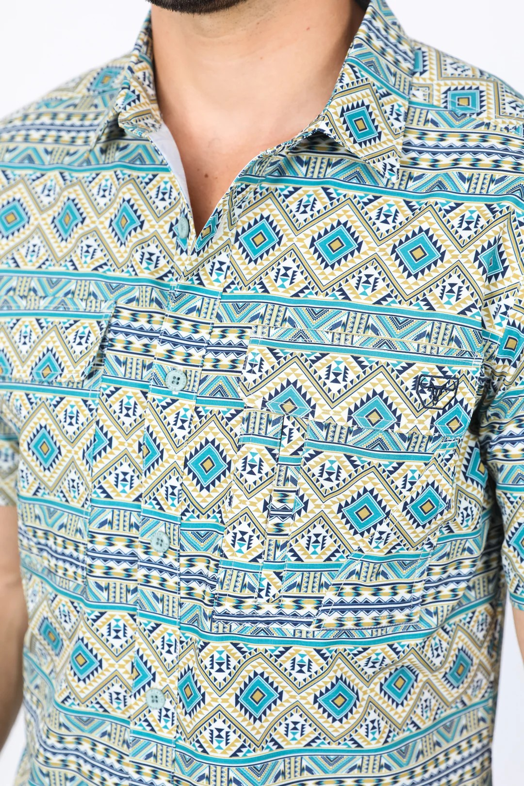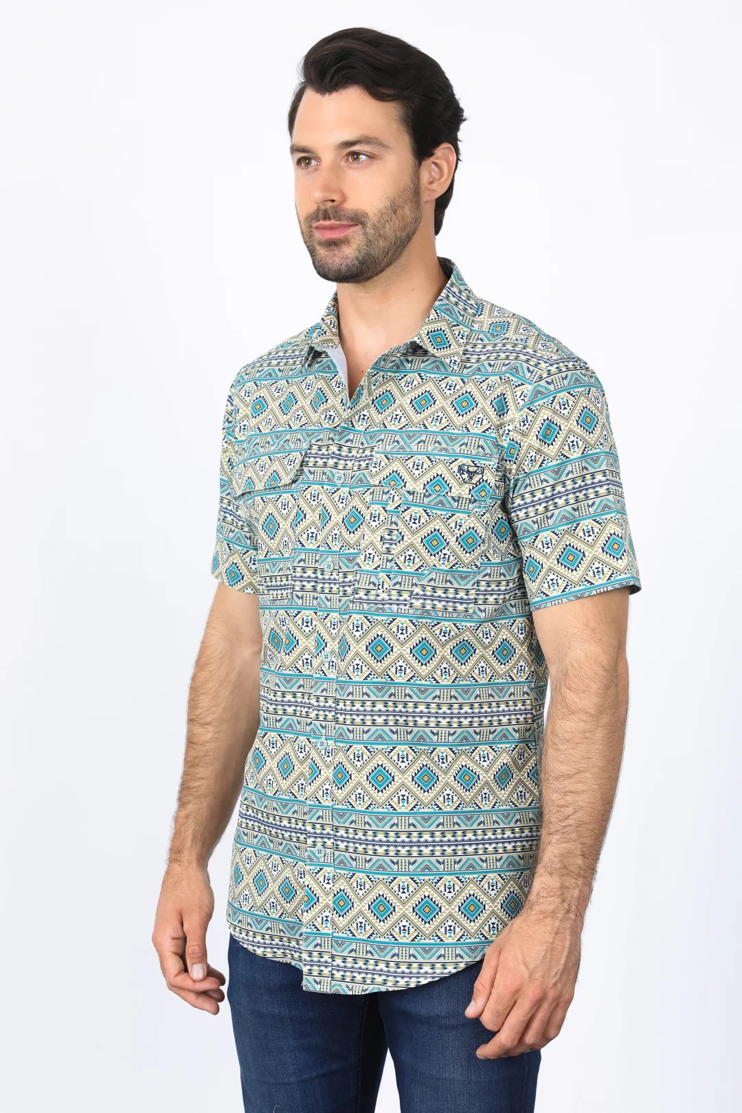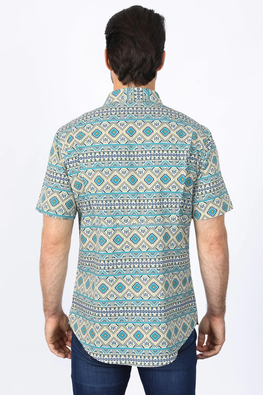 Mens Performance Classic Fit Western Short Sleeve Aztec Print Beige Shirt