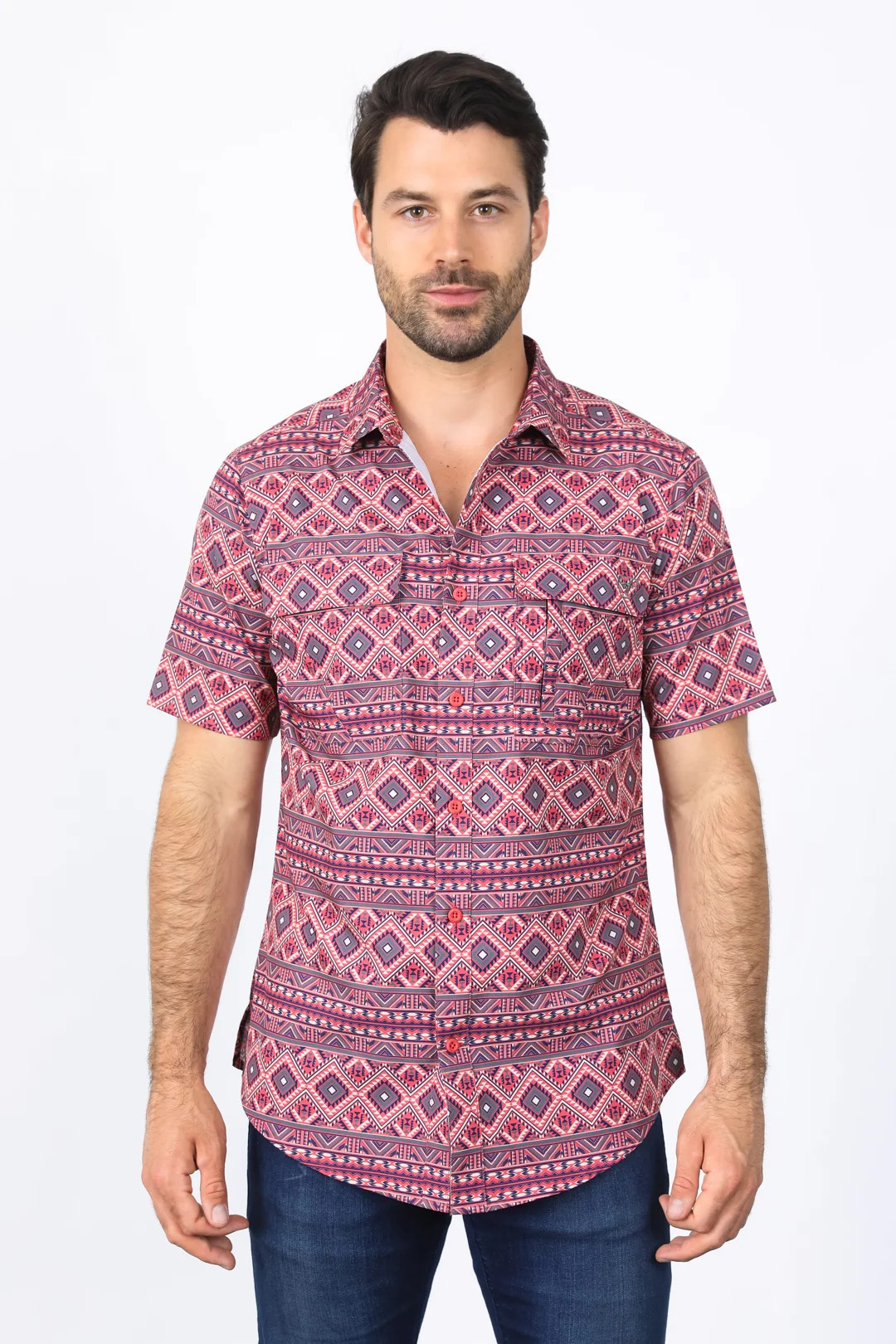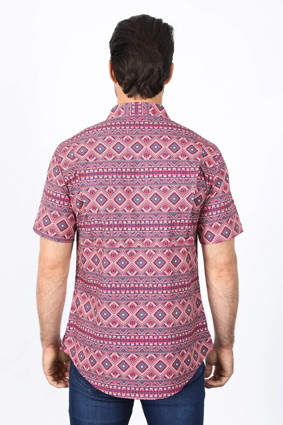 Mens Performance Classic Fit Western Short Sleeve Aztec Print Salmon Shirt