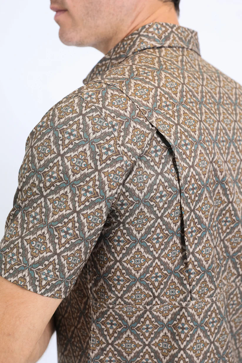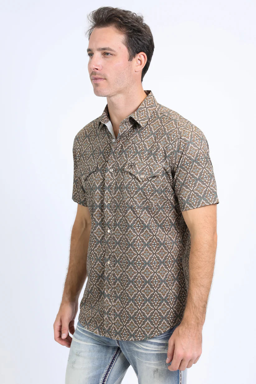 Mens Performance Western Short Sleeve Aztec Print Brown Shirt