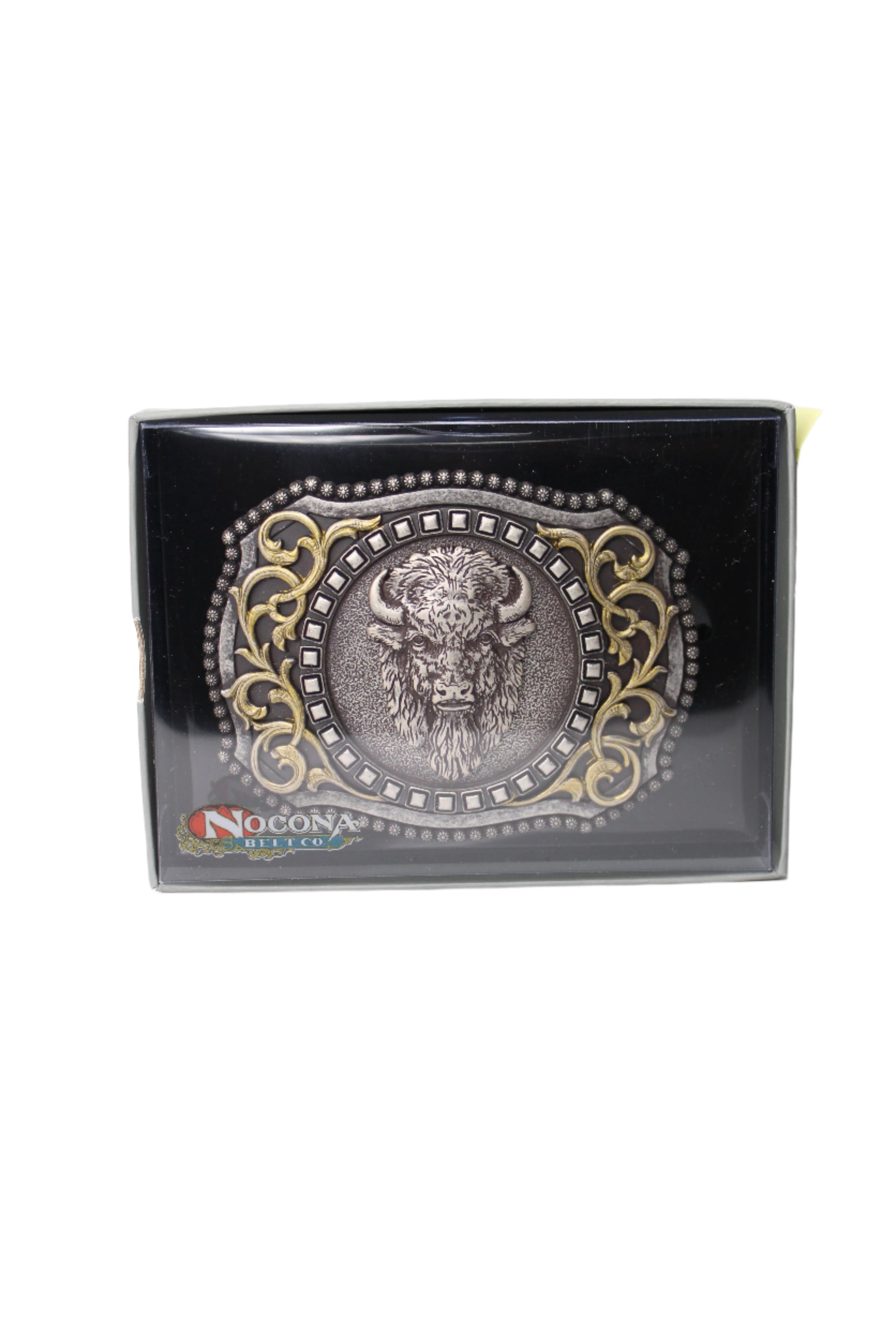 Nocona mens western buckle by M&F Western Products features a detailed buffalo head in the center of a rectangular buckle. The buffalo head is framed by silver squares and then decorated by antique gold scroll design. Measures: 3 X 4.