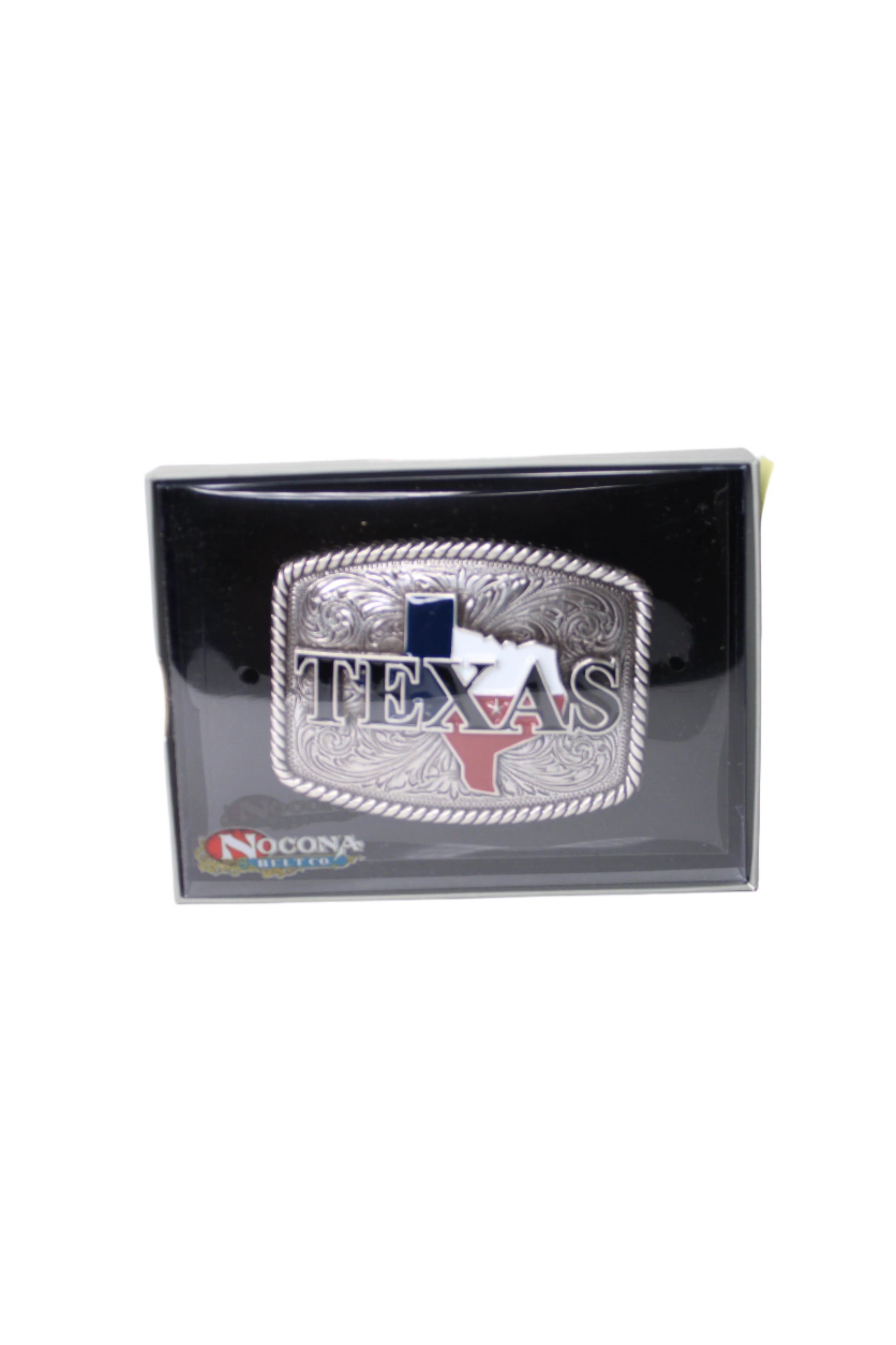 Nocona mens western buckle by M&F Western Products features a silver rope edge rectangle shaped buckle with a red, white and blue Texas with the word ?Texas? across it in black. Measures: 2-1/2 X 3-1/4.