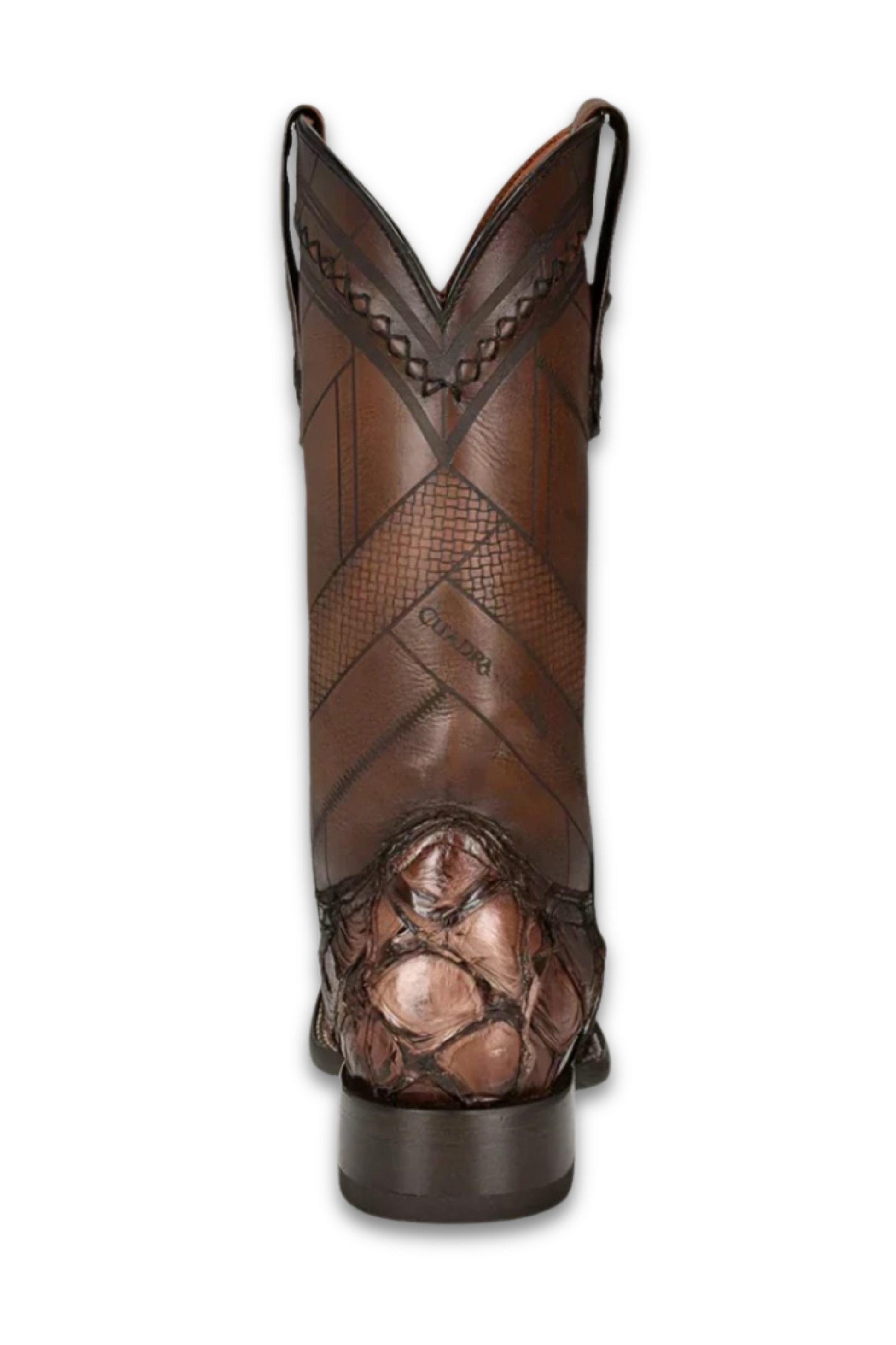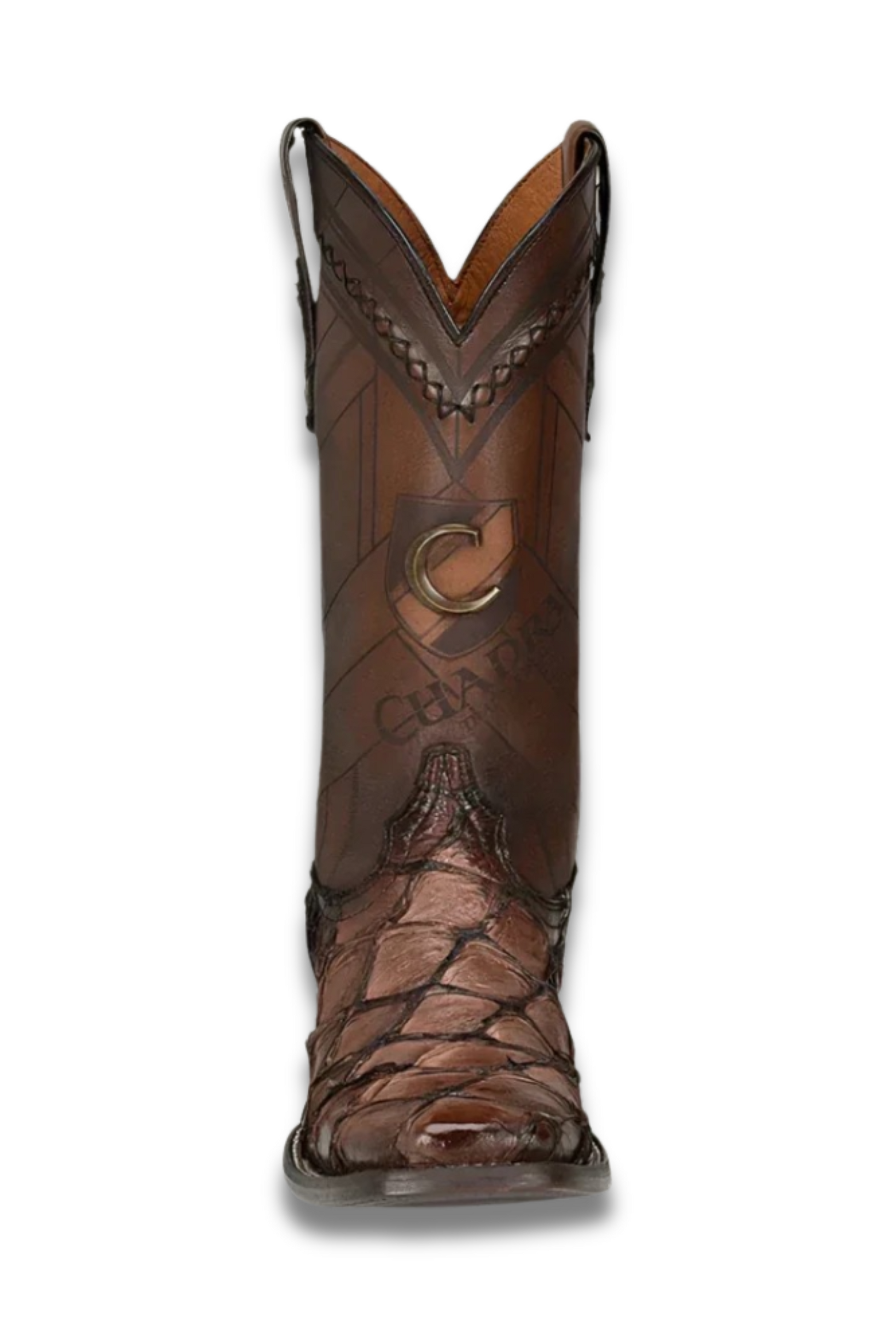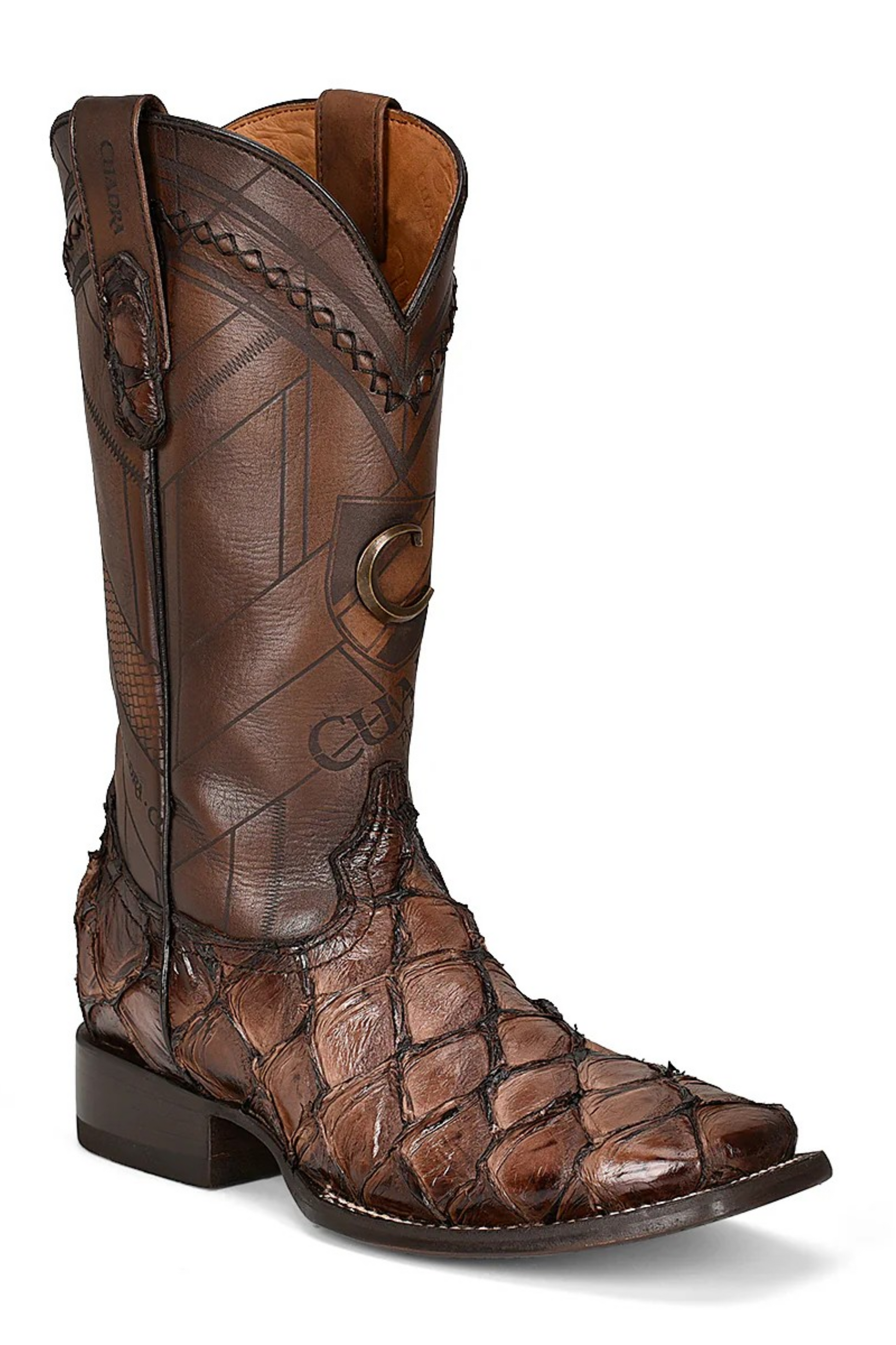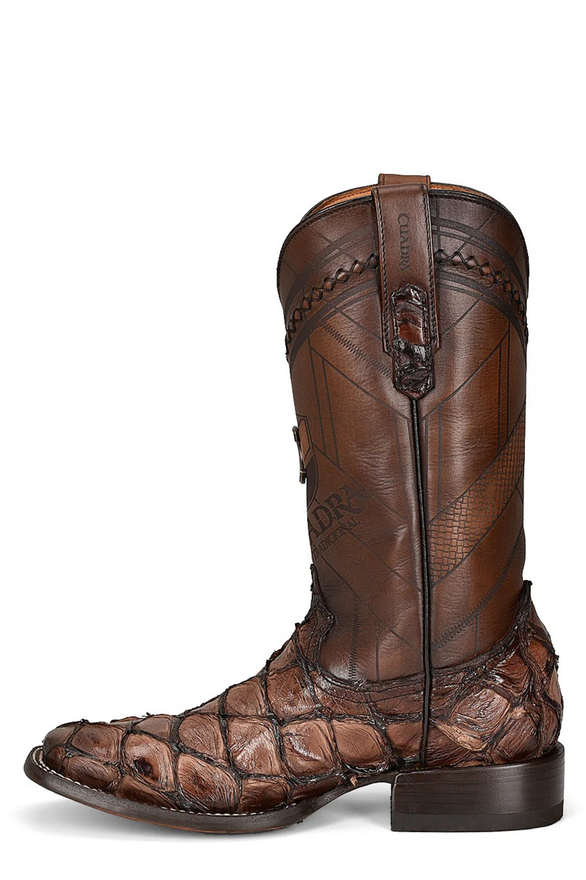 Unique Cuadra Mens Genuine Pirarucu Fish Leather Boots. Rodeo boot for men in genuine pirarucu leather and bovine leather. Over the tube it presents laser engraving of Cuadra logo in the front, handwoven details and metallic application of Cuadra monogram.