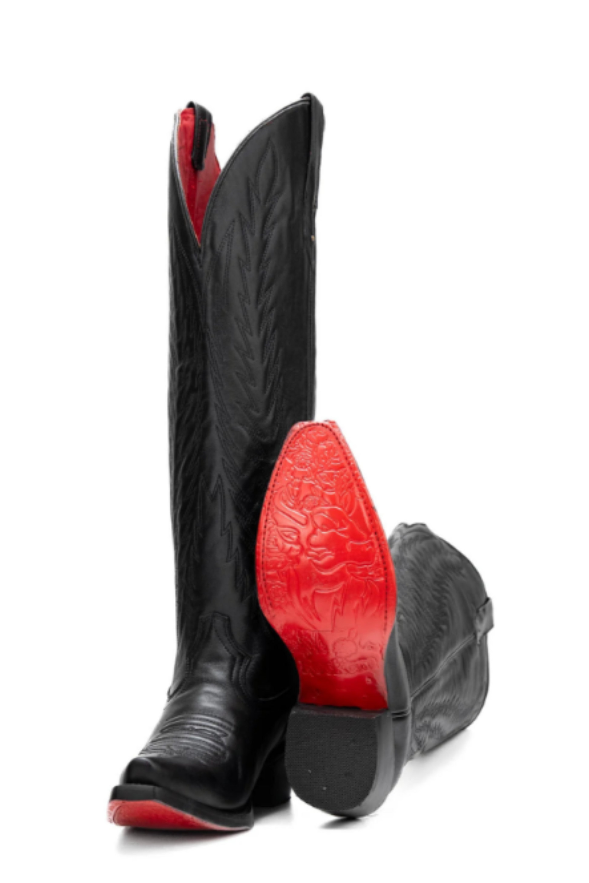 Step into elegance with the Valentina Tall Red Bottom Wide Calf Snip Toe Cowgirl Boot – a captivating blend of classic Western style and bold sophistication. Expertly handcrafted in Mexico from genuine leather, this all-black boot features a tall silhouette with intricate stitching and refined detailing that exudes confidence. The snip toe design, leather sole, and stacked heel offer timeless cowgirl structure, while the striking red bottom adds an unexpected edge. Thoughtfully designed to be wide calf-friendly, the Valentina ensures a comfortable, flattering fit without compromising style. Whether you're headed to a night out, a rodeo, or a special event, this boot brings the perfect mix of elegance and attitude with every step.